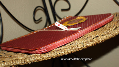 I then adhered patterned paper (yep, the same pattern from yesterday) over the cover, leaving the spine of the book open, so it didn't interfere with the opening and closing of the notebook. I also used the remnant of the ribbon from yesterday to wrap around the cover, and tie it for some detail. I used my Distress Ink in Fired Brick, to add some color to the bottom half of the cover, as well as all the edges when the book is closed. It will make the pages look nice when they are pulled out.